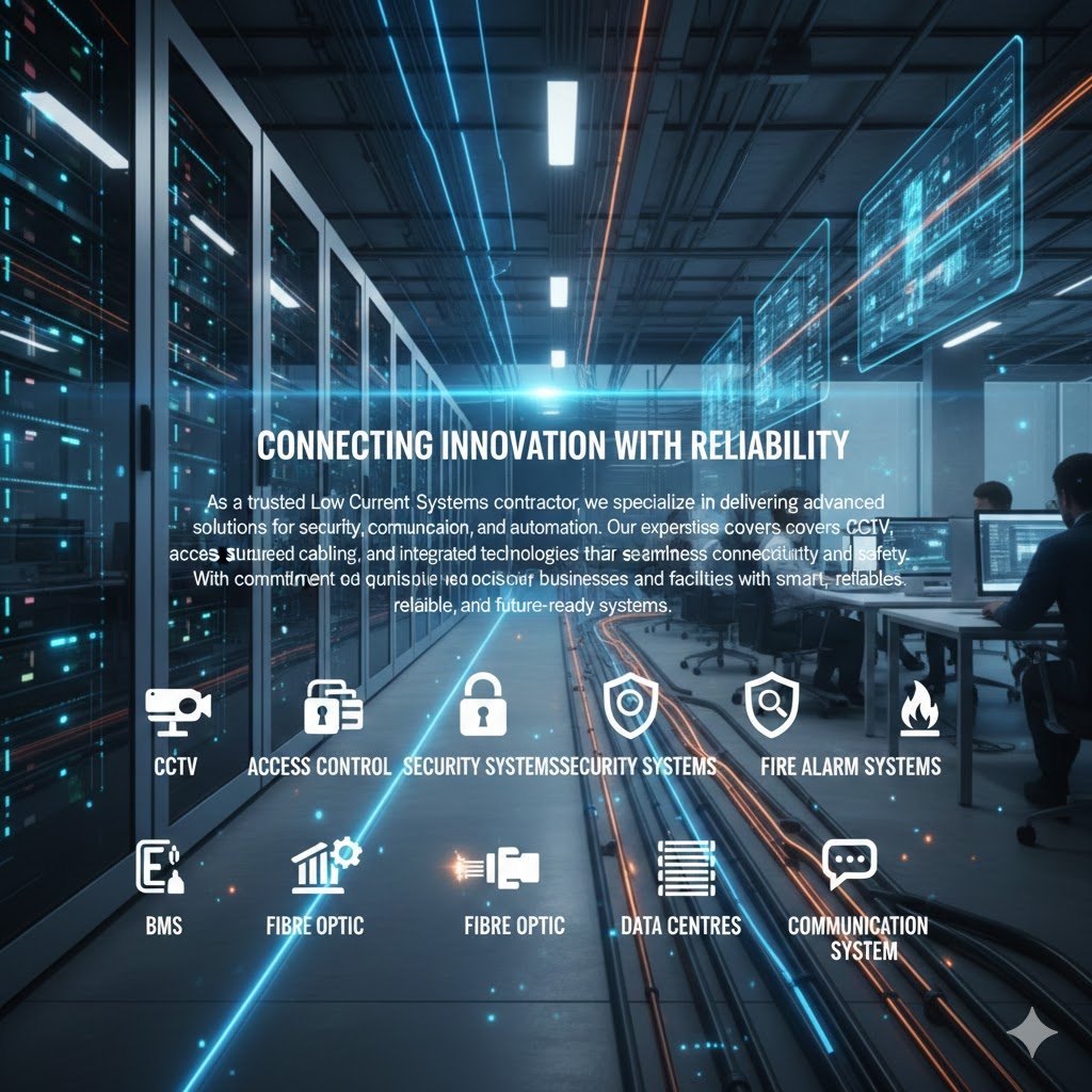 As a trusted Low Current Systems contractor, we specialize in delivering advanced solutions for security, communication, and automation. Our expertise covers CCTV, access control, fire alarm systems, structured cabling, and integrated technologies that ensure seamless connectivity and safety. With a commitment to quality and precision, we empower businesses and facilities with smart, reliable, and future-ready systems.